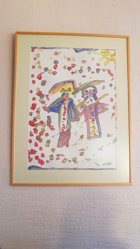 Το έργο τέχνης που ξεχωρίζει στους τοίχους του οινοπαντοπωλείου είναι δημιουργία του μικρού γιου του ιδιοκτήτη. Και κάθε έργο μικρού παιδιού είναι ανεκτίμητης αξίας.