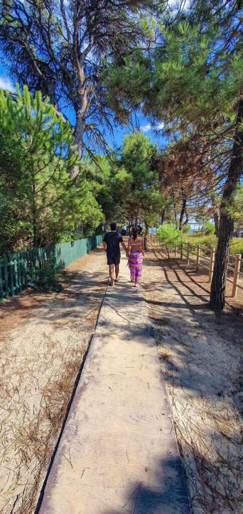 Μέσα απ’ την πυκνή βλάστηση, απ’ το ονειρικό πευκοδάσος απλώνεται η ψιλή χρυσαφένια άμμος.